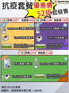 抗疫產品套餐 (Logicmaxx LM03 次氯酸水壺 / V9 家用次氯酸水機 / Green Spring 快速檢測劑 / Yimi Life YM101 血氧計)